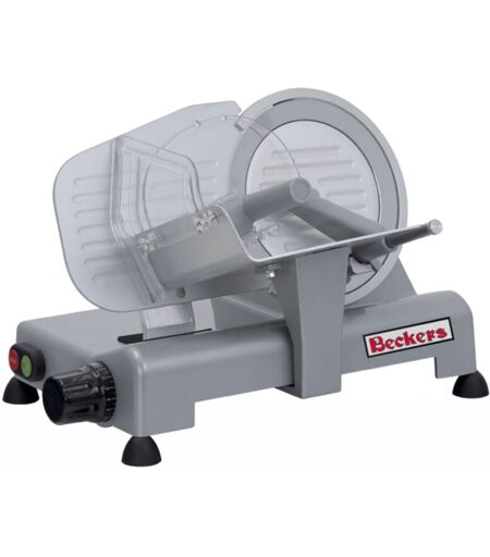 Trancheuse Série E -Beckers Puissance: 120 W Poids: 11 kg Lame ∅ 195 mm Coupe utile: 165x130 mm Course de chariot: 210 mm Largeur: 300mm Profondeur: 430mm Hauteur: 292mm Dimensions de l'emballage: 470x330x370 mm Cadre en aluminium moulé sous pression peint Épaisseur de coupe: 0∾15 mm Aiguiseur amovible Modules 275 et 300 avec poussoir en aluminium Protection de verre de Plexi ...
