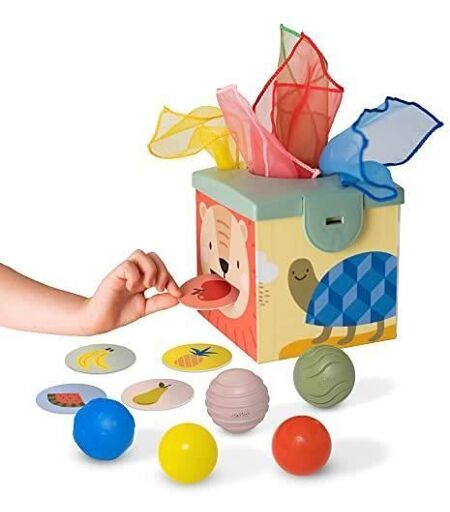 Une boite avec couvercle et fente pour que lenfant puisse tirer les lingettes de tissu, insérer les cartes et jouer avec les balles 5 lingettes en organza, 5 cartes double-face avec fruits et chiffres, 5 balles dont 3 texturées. La boîte est en carton épais et le couvercle en plastique. A partir de 12 mois. Une boite avec couvercle et fente pour que lenfant puisse tirer les lingettes de tissu, insérer les cartes et jouer avec les balles ! Idéal pour développer les notions de permanence de lobjet, lapprentissage et lassociation des couleurs, les formes mais également la motricité et la coordination man-¿il Inclus: 5 lingettes en organza, 5 cartes double-face avec fruits et chiffres, 5 balles dont 3 texturées La boite est en carton épais et le couvercle en plastique Dès 12 mois ...
