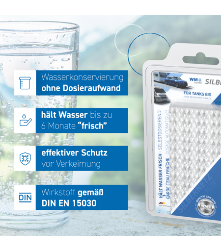 Le filet d'argent assure la conservation automatique de l'eau douce à chaque nouveau remplissage du réservoir. Les ions d'argent purs protègent efficacement l'eau et le système d'eau douce contre la contamination par des germes. Le produit est disponible pour toutes les tailles de réservoirs et de citernes et ne doit être changé qu'une fois par an. Le filet d'argent garantit une libération contrôlée d'ions d'argent à effet biocide dans l'eau environnante. La technologie éprouvée assure déjà dans le réservoir de stockage/réservoir d'eau douce une destruction/inactivation des bactéries, virus et champignons. La capacité de stockage de l'eau ainsi obtenue (conservation de l'eau) s'étend à l'ensemble du système d'alimentation en eau, ce qui permet une protection efficace contre les germes ou la formation d'un biofilm. Mode d'action : L'action du filet d'argent est basée sur la libération d'ions d'argent pur (Ag+). Ces ions d'argent ont un effet microbicide dans une plage de concentration ...