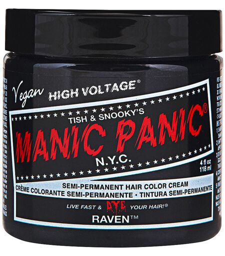 La coloration semi-permanente High Voltage Classic de Manic Panic comprend une multitude de nuances lumineuses. Les ingrédients de qualité utilisés garantissent que tu obtiendras un résultat de coloration de haute qualité. Les ingrédients soignants de la formule conditionnent les cheveux pendant la coloration et garantissent ainsi un fini soyeux et brillant ainsi qu'une sensation de douceur. Raven est un noir froid avec une nuance bleu-vert. Pour obtenir les meilleurs résultats, il est conseillé d'éclaircir les cheveux en blond foncé au niveau 6 avant l'application ou de les colorer sur des cheveux non colorés et non blonds. Contrairement à la plupart des colorations pour cheveux noirs sur le marché, notre Rave ne contient pas l'allergène PPD. Caractéristiques importantes : Niveau de cheveux requis : 6Intensité : VigoureuseLongévité de la couleur : HauteRéactif aux UV : Non Les colorations pour cheveux Manic Panic sont prêtes à l'emploi et aucun révélateur n'est nécessaire. Végétalien et non testé sur les animauxExempt de : PPD, parabènes, ammoniaque, résorcine, phtalates et gluten.Couleur qui dure environ 4 à 6 semainesS'estompe progressivement à chaque lavage de cheveuxLes teintes peuvent être mélangées entre ellesPeut être combiné avec le Pastel-izer pour créer des tons pastels doux et tendance8 teintes réactives aux UV disponibles, qui s'illuminent sous la lumière noirePrêt à l'emploi, aucun révélateur nécessaireMeilleurs résultats sur cheveux pré-éclaircisFabriqué aux États-Unis De combien de boîtes de 118 ml ai-je besoin pour mes cheveux? Cheveux courts à longs : 1 à 2 doses, selon l'épaisseur des cheveux. Cheveux des épaules à la taille : 2 - 3 doses, selon l'épaisseur des cheveux. Pour les cheveux épais, une boîte supplémentaire peut être nécessaire pour les pointes. Cheveux à la taille et plus longs : 3+ doses, selon l'épaisseur des cheveux. Utilisation : 1. laver les cheveux avec un shampooing nettoyant en profondeur, ne pas utiliser d'après-shampooing.2. sèche les cheveux avec un sèche-cheveux pour t'assurer que les cheveux sont extrêmement poreux.3. mets des gants et applique la coloration mèche par mèche à l'aide d'un pinceau à colorer. Assure-toi que chaque mèche de cheveux est suffisamment recouverte de couleur afin d'éviter un résultat taché.4. peigne ensuite les cheveux pour t'assurer que la couleur est répartie uniformément. La crème colorante peut devenir légèrement mousseuse.5. recouvre les cheveux d'une charlotte en plastique et laisse la couleur agir pendant 30 à 45 minutes. Pour plus d'intensité, laisse agir sous une source de chaleur.6. rince les cheveux à l'eau froide jusqu'à ce que l'eau soit claire. Éviter tout contact avec le visage et le corps. Ne pas shampooiner les cheveux.7. coiffer comme souhaité. Pour éviter les transferts de couleur, toujours s'assurer que les cheveux sont complètement secs. Précautions d'emploi : Pour usage externe uniquement. Tenir hors de portée des enfants. Utiliser uniquement selon les... ...