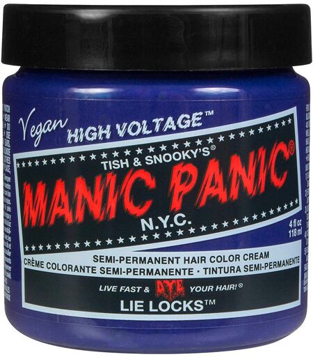 La coloration semi-permanente High Voltage Classic de Manic Panic comprend une multitude de nuances lumineuses. Les ingrédients de qualité utilisés garantissent que tu obtiendras un résultat de coloration de haute qualité. Les ingrédients soignants de la formule conditionnent les cheveux pendant la coloration et garantissent ainsi un fini soyeux et brillant ainsi qu'une sensation de douceur. Lie Locks est une coloration indigo froide, d'intensité moyenne, avec des nuances violettes et bleues. Lie Locks peut donner une teinte indigo aux cheveux non décolorés et non colorés. Pour de meilleurs résultats, nous recommandons d'éclaircir et de teindre les cheveux à un blond très clair (niveau 9 ou plus clair) avant l'application afin d'éviter les nuances indésirables. Caractéristiques importantes : Niveau de cheveux requis : 9 ou plusIntensité : ModéréeLongévité de la couleur : ModéréeRéactif aux UV : Non Les colorations capillaires Manic Panic sont prêtes à l'emploi et aucun révélateur n'est nécessaire. Végétalien et non testé sur les animauxExempt de : PPD, parabènes, ammoniaque, résorcine, phtalates et gluten.Couleur qui dure environ 4 à 6 semainesS'estompe progressivement à chaque lavage de cheveuxLes teintes peuvent être mélangées entre ellesPeut être combiné avec le Pastel-izer pour créer des tons pastels doux et tendance8 teintes réactives aux UV disponibles, qui s'illuminent sous la lumière noirePrêt à l'emploi, aucun révélateur nécessaireMeilleurs résultats sur cheveux pré-éclaircisFabriqué aux États-Unis De combien de boîtes de 118 ml ai-je besoin pour mes cheveux? Cheveux courts à longs : 1 à 2 doses, selon l'épaisseur des cheveux. Cheveux des épaules à la taille : 2 - 3 doses, selon l'épaisseur des cheveux. Pour les cheveux épais, une boîte supplémentaire peut être nécessaire pour les pointes. Cheveux à la taille et plus longs : 3+ doses, selon l'épaisseur des cheveux. Utilisation : 1. laver les cheveux avec un shampooing nettoyant en profondeur, ne pas utiliser d'après-shampooing.2. sèche les cheveux avec un sèche-cheveux pour t'assurer que les cheveux sont extrêmement poreux.3. mets des gants et applique la coloration mèche par mèche à l'aide d'un pinceau à colorer. Assure-toi que chaque mèche de cheveux est suffisamment recouverte de couleur afin d'éviter un résultat taché.4. peigne ensuite les cheveux pour t'assurer que la couleur est répartie uniformément. La crème colorante peut devenir légèrement mousseuse.5. recouvre les cheveux d'une charlotte en plastique et laisse la couleur agir pendant 30 à 45 minutes. Pour plus d'intensité, laisse agir sous une source de chaleur.6. rince les cheveux à l'eau froide jusqu'à ce que l'eau soit claire. Éviter tout contact avec le visage et le corps. Ne pas shampooiner les cheveux.7. coiffer comme souhaité. Pour éviter les transferts de couleur, toujours s'assurer que les cheveux sont complètement secs. Précautions d'emploi : Pour usage externe uniquement. Tenir hors de portée des enfants. Utiliser... ...