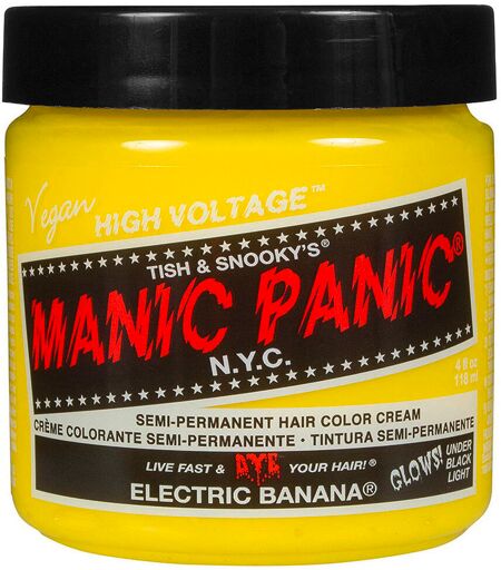 La coloration semi-permanente High Voltage Classic de Manic Panic comprend une multitude de nuances lumineuses. Les ingrédients de qualité utilisés garantissent que tu obtiendras un résultat de coloration de haute qualité. Les ingrédients soignants de la formule conditionnent les cheveux pendant la coloration et garantissent ainsi un fini soyeux et brillant ainsi qu'une sensation de douceur. Electric Banana est une coloration jaune fluo claire qui se reflète légèrement en vert à la lumière du soleil et qui brille sous la lumière noire ! Pour obtenir un résultat particulièrement lumineux, nous te conseillons d'éclaircir tes cheveux au degré de blond 10 ou plus clair avant l'application. Caractéristiques importantes : Niveau de cheveux requis : 10 ou plusIntensité : modéréeLongévité de la couleur : ModéréeRéactif aux UV : Oui Les colorations capillaires Manic Panic sont prêtes à l'emploi et aucun révélateur n'est nécessaire. Végétalien et non testé sur les animauxExempt de : PPD, parabènes, ammoniaque, résorcine, phtalates et gluten.Couleur qui dure environ 4 à 6 semainesS'estompe progressivement à chaque lavage de cheveuxLes teintes peuvent être mélangées entre ellesPeut être combiné avec le Pastel-izer pour créer des tons pastels doux et tendance8 teintes réactives aux UV disponibles, qui s'illuminent sous la lumière noirePrêt à l'emploi, aucun révélateur nécessaireMeilleurs résultats sur cheveux pré-éclaircisFabriqué aux États-Unis De combien de boîtes de 118 ml ai-je besoin pour mes cheveux? Cheveux courts à longs : 1 à 2 doses, selon l'épaisseur des cheveux. Cheveux des épaules à la taille : 2 - 3 doses, selon l'épaisseur des cheveux. Pour les cheveux épais, une boîte supplémentaire peut être nécessaire pour les pointes. Cheveux à la taille et plus longs : 3+ doses, selon l'épaisseur des cheveux. Utilisation : 1. laver les cheveux avec un shampooing nettoyant en profondeur, ne pas utiliser d'après-shampooing.2. sèche les cheveux avec un sèche-cheveux pour t'assurer que les cheveux sont extrêmement poreux.3. mets des gants et applique la coloration mèche par mèche à l'aide d'un pinceau à colorer. Assure-toi que chaque mèche de cheveux est suffisamment recouverte de couleur afin d'éviter un résultat taché.4. peigne ensuite les cheveux pour t'assurer que la couleur est répartie uniformément. La crème colorante peut devenir légèrement mousseuse.5. recouvre les cheveux d'une charlotte en plastique et laisse la couleur agir pendant 30 à 45 minutes. Pour plus d'intensité, laisse agir sous une source de chaleur.6. rince les cheveux à l'eau froide jusqu'à ce que l'eau soit claire. Éviter tout contact avec le visage et le corps. Ne pas shampooiner les cheveux.7. coiffer comme souhaité. Pour éviter les transferts de couleur, toujours s'assurer que les cheveux sont complètement secs. Précautions d'emploi : Pour usage externe uniquement. Tenir hors de portée des enfants. Utiliser uniquement selon les instructions. Ce produit contient des ingrédients qui... ...