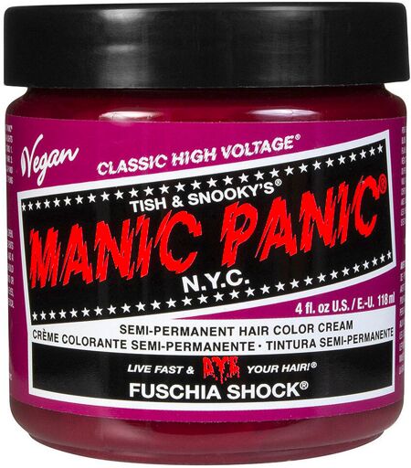 La coloration semi-permanente High Voltage Classic de Manic Panic comprend une multitude de nuances lumineuses. Les ingrédients de qualité utilisés garantissent que tu obtiendras un résultat de coloration de haute qualité. Les ingrédients soignants de la formule conditionnent les cheveux pendant la coloration et garantissent ainsi un fini soyeux et brillant ainsi qu'une sensation de douceur. Fuschia Shock est une coloration fuchsia profonde et froide. Cette teinte est le rose le plus foncé et peut créer des tons fuchsia sur des cheveux non colorés et non blonds. Pour de meilleurs résultats, nous recommandons toutefois d'éclaircir les cheveux pour obtenir un blond clair (niveau 8 ou plus clair). Caractéristiques importantes : Niveau de cheveux requis : 8 ou plusIntensité : VigoureuseDurabilité de la couleur : ModéréeRéactif aux UV : Non Les colorations Manic Panic sont prêtes à l'emploi et aucun révélateur n'est nécessaire. Végétalien et non testé sur les animauxExempt de : PPD, parabènes, ammoniaque, résorcine, phtalates et gluten.Couleur qui dure environ 4 à 6 semainesS'estompe progressivement à chaque lavage de cheveuxLes teintes peuvent être mélangées entre ellesPeut être combiné avec le Pastel-izer pour créer des tons pastels doux et tendance8 teintes réactives aux UV disponibles, qui s'illuminent sous la lumière noirePrêt à l'emploi, aucun révélateur nécessaireMeilleurs résultats sur cheveux pré-éclaircisFabriqué aux États-Unis De combien de boîtes de 118 ml ai-je besoin pour mes cheveux? Cheveux courts à longs : 1 à 2 doses, selon l'épaisseur des cheveux. Cheveux des épaules à la taille : 2 - 3 doses, selon l'épaisseur des cheveux. Pour les cheveux épais, une boîte supplémentaire peut être nécessaire pour les pointes. Cheveux à la taille et plus longs : 3+ doses, selon l'épaisseur des cheveux. Utilisation : 1. laver les cheveux avec un shampooing nettoyant en profondeur, ne pas utiliser d'après-shampooing.2. sèche les cheveux avec un sèche-cheveux pour t'assurer que les cheveux sont extrêmement poreux.3. mets des gants et applique la coloration mèche par mèche à l'aide d'un pinceau à colorer. Assure-toi que chaque mèche de cheveux est suffisamment recouverte de couleur afin d'éviter un résultat taché.4. peigne ensuite les cheveux pour t'assurer que la couleur est répartie uniformément. La crème colorante peut devenir légèrement mousseuse.5. recouvre les cheveux d'une charlotte en plastique et laisse la couleur agir pendant 30 à 45 minutes. Pour plus d'intensité, laisse agir sous une source de chaleur.6. rince les cheveux à l'eau froide jusqu'à ce que l'eau soit claire. Éviter tout contact avec le visage et le corps. Ne pas shampooiner les cheveux.7. coiffer comme souhaité. Pour éviter les transferts de couleur, toujours s'assurer que les cheveux sont complètement secs. Précautions d'emploi : Pour usage externe uniquement. Tenir hors de portée des enfants. Utiliser uniquement selon les instructions. Ce produit contient des ingrédients qui... ...