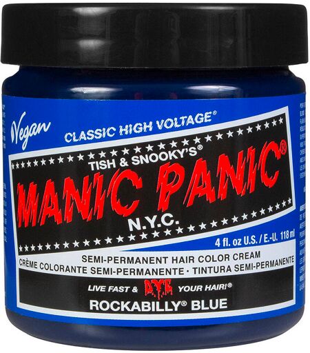 La coloration semi-permanente High Voltage Classic de Manic Panic comprend une multitude de nuances lumineuses. Les ingrédients de qualité utilisés garantissent que tu obtiendras un résultat de coloration de haute qualité. Les ingrédients soignants de la formule conditionnent les cheveux pendant la coloration et garantissent ainsi un fini soyeux et brillant ainsi qu'une sensation de douceur. Rockabilly Blue est l'une de nos couleurs de cheveux bleues neutres les plus fortes. Ce bleu lumineux et ultra-fort laisse des tons froids sur les cheveux non colorés et non décolorés. Pour des résultats optimaux, nous recommandons d'éclaircir les cheveux au degré de blond 9 ou plus clair et de les teindre avant l'application afin d'éviter les nuances indésirables. Caractéristiques importantes : Niveau de cheveux requis : 9 ou plusIntensité : ModéréeLongévité de la couleur : ModéréeRéactif aux UV : Non Les colorations capillaires Manic Panic sont prêtes à l'emploi et aucun révélateur n'est nécessaire. Végétalien et non testé sur les animauxExempt de : PPD, parabènes, ammoniaque, résorcine, phtalates et gluten.Couleur qui dure environ 4 à 6 semainesS'estompe progressivement à chaque lavage de cheveuxLes teintes peuvent être mélangées entre ellesPeut être combiné avec le Pastel-izer pour créer des tons pastels doux et tendance8 teintes réactives aux UV disponibles, qui s'illuminent sous la lumière noirePrêt à l'emploi, aucun révélateur nécessaireMeilleurs résultats sur cheveux pré-éclaircisFabriqué aux États-Unis De combien de boîtes de 118 ml ai-je besoin pour mes cheveux? Cheveux courts à longs : 1 à 2 doses, selon l'épaisseur des cheveux. Cheveux des épaules à la taille : 2 - 3 doses, selon l'épaisseur des cheveux. Pour les cheveux épais, une boîte supplémentaire peut être nécessaire pour les pointes. Cheveux à la taille et plus longs : 3+ doses, selon l'épaisseur des cheveux. Utilisation : 1. laver les cheveux avec un shampooing nettoyant en profondeur, ne pas utiliser d'après-shampooing.2. sèche les cheveux avec un sèche-cheveux pour t'assurer que les cheveux sont extrêmement poreux.3. mets des gants et applique la coloration mèche par mèche à l'aide d'un pinceau à colorer. Assure-toi que chaque mèche de cheveux est suffisamment recouverte de couleur afin d'éviter un résultat taché.4. peigne ensuite les cheveux pour t'assurer que la couleur est répartie uniformément. La crème colorante peut devenir légèrement mousseuse.5. recouvre les cheveux d'une charlotte en plastique et laisse la couleur agir pendant 30 à 45 minutes. Pour plus d'intensité, laisse agir sous une source de chaleur.6. rince les cheveux à l'eau froide jusqu'à ce que l'eau soit claire. Éviter tout contact avec le visage et le corps. Ne pas shampooiner les cheveux.7. coiffer comme souhaité. Pour éviter les transferts de couleur, toujours s'assurer que les cheveux sont complètement secs. Précautions d'emploi : Pour usage externe uniquement. Tenir hors de portée des enfants. Utiliser uniquement... ...