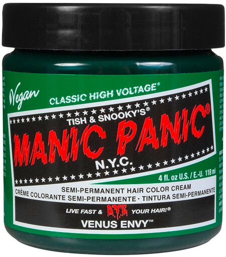 La coloration semi-permanente High Voltage Classic de Manic Panic comprend une multitude de nuances lumineuses. Les ingrédients de qualité utilisés garantissent que tu obtiendras un résultat de coloration de haute qualité. Les ingrédients soignants de la formule conditionnent les cheveux pendant la coloration et garantissent ainsi un fini soyeux et brillant ainsi qu'une sensation de douceur. Venus Envy est une coloration verte foncée à base de bleu qui illumine même les cheveux non décolorés d'une profonde teinte émeraude. Pour de meilleurs résultats, nous recommandons d'éclaircir les cheveux au niveau de blond 8 ou plus clair. Si tu as un blond de niveau 9 ou plus clair, tu peux voir plus de nuances bleu-vert dans tes cheveux ! Caractéristiques importantes : Niveau de cheveux requis : 8 ou plusIntensité : VigoureuseLongévité de la couleur : HauteRéactif aux UV : Non Les colorations capillaires Manic Panic sont prêtes à l'emploi et aucun révélateur n'est nécessaire. Végétalien et non testé sur les animauxExempte de : PPD, parabènes, ammoniaque, résorcine, phtalates et gluten.Couleur qui dure environ 4 à 6 semainesS'estompe progressivement à chaque lavage de cheveuxLes teintes peuvent être mélangées entre ellesPeut être combiné avec le Pastel-izer pour créer des tons pastels doux et tendance8 teintes réactives aux UV disponibles, qui s'illuminent sous la lumière noirePrêt à l'emploi, aucun révélateur nécessaireMeilleurs résultats sur cheveux pré-éclaircisFabriqué aux États-Unis De combien de boîtes de 118 ml ai-je besoin pour mes cheveux? Cheveux courts à longs : 1 à 2 doses, selon l'épaisseur des cheveux. Cheveux des épaules à la taille : 2 - 3 doses, selon l'épaisseur des cheveux. Pour les cheveux épais, une boîte supplémentaire peut être nécessaire pour les pointes. Cheveux à la taille et plus longs : 3+ doses, selon l'épaisseur des cheveux. Utilisation : 1. laver les cheveux avec un shampooing nettoyant en profondeur, ne pas utiliser d'après-shampooing.2. sèche les cheveux avec un sèche-cheveux pour t'assurer que les cheveux sont extrêmement poreux.3. mets des gants et applique la coloration mèche par mèche à l'aide d'un pinceau à colorer. Assure-toi que chaque mèche de cheveux est suffisamment recouverte de couleur afin d'éviter un résultat taché.4. peigne ensuite les cheveux pour t'assurer que la couleur est répartie uniformément. La crème colorante peut devenir légèrement mousseuse.5. recouvre les cheveux d'une charlotte en plastique et laisse la couleur agir pendant 30 à 45 minutes. Pour plus d'intensité, laisse agir sous une source de chaleur.6. rince les cheveux à l'eau froide jusqu'à ce que l'eau soit claire. Éviter tout contact avec le visage et le corps. Ne pas shampooiner les cheveux.7. coiffer comme souhaité. Pour éviter les transferts de couleur, toujours s'assurer que les cheveux sont complètement secs. Précautions d'emploi : Pour usage externe uniquement. Tenir hors de portée des enfants. Utiliser uniquement selon les... ...