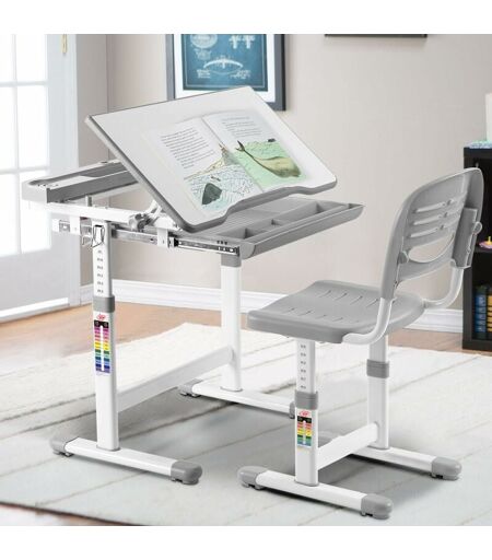 Bureau Enfant, Ensemble Table et Chaise pour Enfants avec Tiroir Hauteur Ajustable (Gris) - Costway