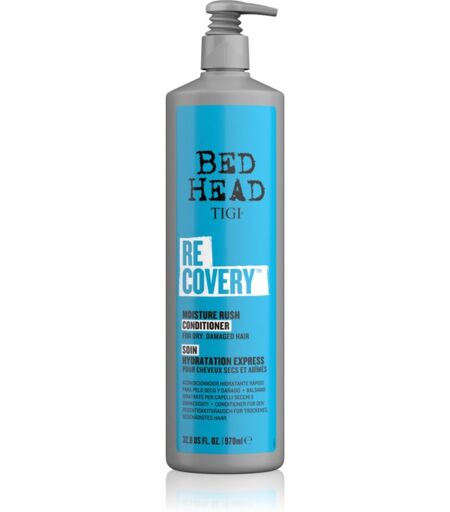 TIGI Bed Head Recovery, 970 ml, Après-shampoings pour femme, En lavant vos cheveux, le shampoing ouvre les cuticules qui constituent la structure superficielle du cheveu. Il est donc important de bien refermer les cuticules après le lavage. C’est le rôle de l’après-shampoing TIGI Recovery Moisturerush Conditioner. Il se charge de sceller les fibres capillaires, mais aussi de les nourrir, de les hydrater et de les assouplir pour obtenir une belle chevelure brillante et saine. Il permet également de protéger les cheveux des dommages mécaniques et du dessèchement en lissant leur surface pour les assouplir et les rendre faciles à démêler et à coiffer. Le produit : apporte l’hydratation nécessaire facilite le coiffage des cheveux qui sont plus dociles répare les dégradations mécaniques et chimiques protège les cheveux pour qu’ils ne s’abîment pas referme la surface des cheveux, les rendant ainsi plus résistants Mode d’emploi : Appliquez sur des cheveux qui viennent d’être lavés au shampoing. Laissez agir quelques minutes, puis rincez bien. ...