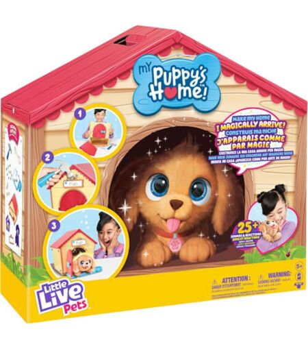 Moose Toys 26477 Little Live Pets Chien My Puppy's Home - set de jeu interactif - - Crée un foyer plein de magie ! Avec le set de jeu My Puppy's Home de Little Live Pets, tu peux construire une niche pour chien et te laisser ensuite surprendre par un chiot en peluche super mignon ! My Puppy's Home est livré sous forme de kit complet avec tous les outils et accessoires nécessaires, adaptés aux enfants, pour construire une adorable petite niche. - - Une fois les murs et le toit assemblés, il est temps de poser le paillasson et de remplir la gamelle d'eau du chiot. Les adorables petites empreintes de pattes apparaissent comme par magie sur le tapis et suscitent à coup sûr l'enthousiasme ! Ouah ! On dirait qu'il y a un nouveau venu ! Il ne te reste plus qu'à donner un nom à ton chiot et à fixer sa plaque d'identité sur la niche. C'est le moment de faire une surprise très spéciale : quel est ce bruit à l'intérieur* Ouvre la porte ! Ouah ! Un adorable petit chiot en peluche est apparu comme par magie et ne demande qu'à être caressé ! Je me demande quel petit chien a emménagé chez toi* Aura-t-il un pelage brun ou blond* Ton adorable petit chien est particulièrement joueur et garantit un plaisir de jeu interactif avec plus de 25 sons et réactions. Il aime mâchouiller et jouer avec son os à jouet fourni ! Le chiot électronique réagit également au toucher, exactement comme un véritable animal domestique. De plus, My Puppy's Home contient un certificat d'adoption à remplir. L'instant de surprise magique peut être répété à plusieurs reprises. My Puppy's Home offre un divertissement varié avec une niche à construire, une révélation surprenante et un animal en peluche interactif et douillet. Crée la maison parfaite pour ton propre chiot. - - - Contenu: 1 x niche pour chien, 1 x chiot en peluche interactif, 1 x écuelle d'eau, 1 x paillasson, 1 x plaque d'identité, 1 x marteau de jouet, 9 x clous jouets, 1 x jouet en os, 1 x certificat de naissance, 1 x mode d'emploi, 2 x piles de type AA - À partir de 5 ans ...