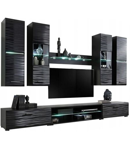 En journée, misez sur l'éclat du laqué noir effet 3D qui la nuit venue laissera place à un éclairage inédit. Cet ensemble de salon NINJA se démarque par son éclairage à LED intégré et par son espace de rangement important. Les façades (portes) sont en finition laquée en MDF, arrivent protégées par un film à enlever après le montage. Les structures (caissons) sont en finition mat en mélaminé. Lumières LEDS sont inclus. Poids total du produit emballé en 5 cartons : 135 kg La photo présente le produit réel. Fabriqué en union européenne, emballé d'usine. Style: Moderne Produit neuf direct d'usine : Objet neuf et intact, vendu dans son emballage d'origine, à monter soi-même. Les dimensions : 8 éléments en tout de largueur total 280 cm et profondeur 43 cm Meuble bas en 3 parties avec deux placards avec LED - Longueur 280cm / Hauteur 35cm / Profondeur 43cm 2x Meubles vitrines suspendus avec LED - 33cm / 116cm / 35cm 2x Meubles suspendus avec LED - 33cm / 116cm / 35cm Étagère LED - 120 cm de ...