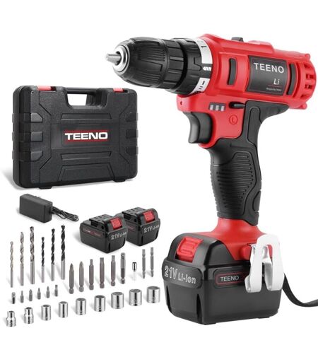 Perceuse Visseuse sans Fil Teeno 21V - Deux 1.5Ah Batteries - 41 accessoires - Gants professionnels - Rouge