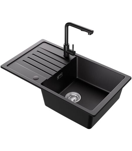 CECIPA MAX Granit Evier 1 Bac avec Egouttoir, 78 x 45 cm Evier de Cuisine en Quartz et Résine Grande Capacité Evier, Mitigeur de Cuisine avec Douchette