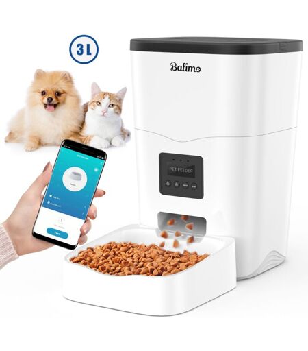 BALIMO 3L, 2.4G WiFi, Distributeur Croquettes Chats et Chiens, Automatique avec Minuterie et télécommande app Max, 1-10 Repas par Jour, Blanc