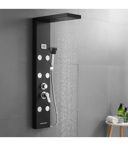 AURALUM Colonne de douche hydromassante Noire avec écran Affichage LCD Pommeau de Douche 6 jets de massage 4 modes de douche Ensemble de Douche en Acier Inox