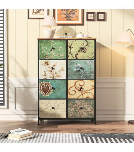 Design Vintage Élégant : Ce meuble à tiroirs avec un design vintage et artistique apportera une touche rétro chic à votre intérieur. Chaque tiroir est décoré de motifs floraux colorés sur un fond de tissu, offrant une finition unique et décorative. Parfait pour ajouter du caractère à votre salon, entrée ou chambre. Rangement Spacieux et Organisé : Ce meuble à 8 tiroirs offre une capacité de rangement généreuse, idéale pour organiser vos vêtements, accessoires, linge de maison ou même des objets décoratifs. Chaque tiroir est conçu pour être spacieux et pratique, avec un système d’ouverture facile grâce à une poignée ronde et ergonomique. Structure Robuste et Stabilité : Fabriqué avec un cadre en métal robuste et des pieds réglables, ce meuble assure une stabilité maximale. Il peut supporter jusqu'à 30 kg de poids, ce qui en fait une solution idéale pour un usage quotidien. Facile à Monter : Ce meuble est facile à assembler, avec un montage simple et rapide. Il peut être monté en ...