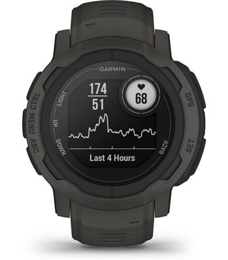 Montre Garmin Instinct 2 Graphite en forme de bracelet en caoutchouc avec un affichage numérique. Permet une lisibilité facile. ...