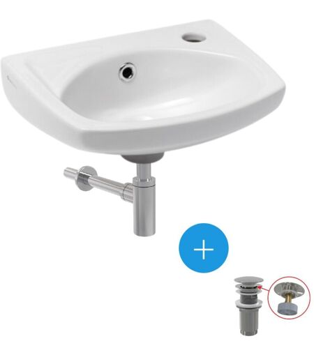 Siko - Ensemble lave-main suspendu avec trou pour robinetterie, trop plein, 35x28cm + Bonde clic-clac + Siphon de lavabo (EUR913-SET2)