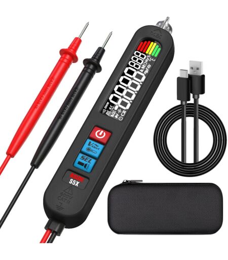 BSIDE S5X Multimètre numérique intelligent Écran couleur Stylo rechargeable Testeur de tension électrique Mesure de la capacité Diode VFC Ohm et température ambiante avec lampe de poche Description du produit : [Rechargeable] : Le multimètre numérique intelligent est livré avec une batterie rechargeable et un câble de charge pour vous assurer de ne jamais avoir à vous soucier de manquer d'énergie pendant les mesures. [Mode intelligent] Ce multimètre numérique mesure automatiquement la tension alternative et continue, la résistance et la continuité avec une résolution optimale. [Test de température ambiante] Le testeur de tension électronique BSIDE S5X peut également être utilisé comme capteur de température, élargissant considérablement les applications de test et éliminant le besoin de s'inquiéter du fait que le capteur de température prenne trop de place. [Multimètre stylo] : Ce voltmètre numérique de poche peut mesurer avec précision les diodes, les tensions AC/DC, la résistance, ...