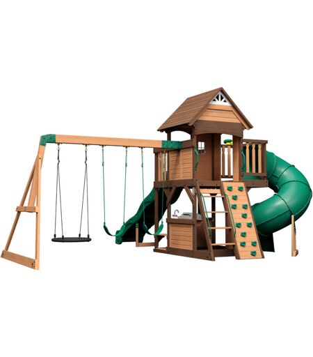 Backyard Discovery Cedar Cove Maisonnette en bois avec Balancoires, Toboggan Double Mur d'Escalade et Banc Balancoire Exterieur avec Toboggan,