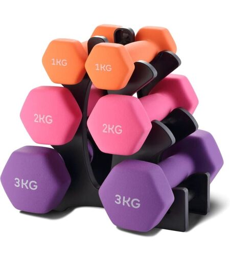 TEENO Haltères en Néoprène Lot de 6 avec Support, Salle de Sport, Surface Résistante à L'eau, 2 x 1 kg, 2 x 2 kg, 2 x 3 kg, Kit D'haltères