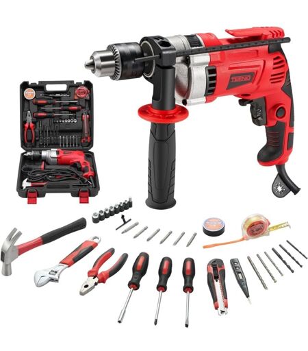 TEENO Perceuse à Percussion Filaire Electrique 910W 220-240V, Perceuse Électrique à Percussion 0-3000 rpm avec 37 Pièces Caisse à Outil Complete Tournevis
