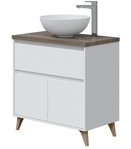 ABITARE Meuble de salle de bain au sol 80 cm 2 portes et 1 tiroir blanc brillant et orme avec vasque à poser – Viborg - Blanc brillant 80 cm Avec miroir et