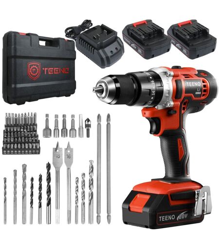 TEENO Perceuse visseuse à percussion 20 v 45Nm, Perceuse à percussion sans fil 2 x 2Ah batteries, 25+3 Réglages de Couple, 69 Accessoires, pour Bricolage