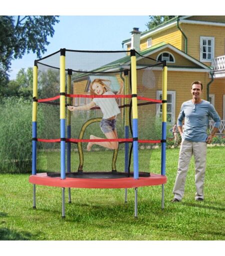 Trampoline pour enfants avec panier de basketball : mini-trampoline utilisable à l’intérieur et à l’extérieur, idéal pour les anniversaires ou Noël des enfants. Capacité de poids : 45 kg. Taille totale (H x L) : 164 x 140 cm. Couleurs : rouge/jaune/bleu. Matériaux de haute qualité Le cadre du trampoline est en acier, ce qui renforce sa solidité et sa durabilité. Des protections en mousse épaisse recouvrent les barres de sécurité et garantissent leur longévité. Le filet de sécurité renforcé, conçu sur mesure, est fabriqué en tissu à haute densité. Avec panier de basketball Ce trampoline de jardin est équipé d’un panier de basketball, d’une pompe et de 2 ballons de basketball. Ainsi, vos enfants peuvent profiter de diverses formes de divertissement avec leurs amis tout en jouissant du plaisir du trampoline. Support stable 6 supports de base en acier galvanisé offrent un soutien stable au produit. Un tissu souple recouvre les ressorts de sécurité, vous évitant de craindre que les pieds ...