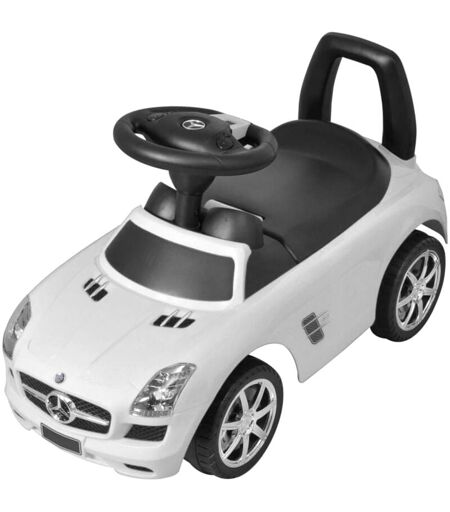 Cette voiture à pousser pour enfants au style Mercedes-Benz est un jouet réaliste et sûr. Elle joue six chansons activées par des boutons sur le volant. Elle peut également émettre des sons de klaxon pour imiter une vraie voiture. Elle dispose d'un espace de stockage sous le siège pour accueillir de petits jouets. Grâce à sa construction en plastique durable, cette voiture à pousser peut supporter jusqu'à 23 kg et convient aux enfants à partir de 2 ans. La base stable à quatre roues permet aux enfants de monter et de descendre facilement d'eux-mêmes. À Mercedes-Benz et la conception du produit sont soumis aux droits de propriété intellectuelle de Daimler AG. Veuillez noter que 2 piles AA sont nécessaires pour les sons et ne sont pas incluses dans notre livraison. Avertissement : Utilisez ce véhicule uniquement sur des terrains privés avec l'autorisation du propriétaire. Dans le cas contraire, cela pourrait entraîner des accidents et / ou des blessures graves. Taille : 66,2 x 28,7 x ...