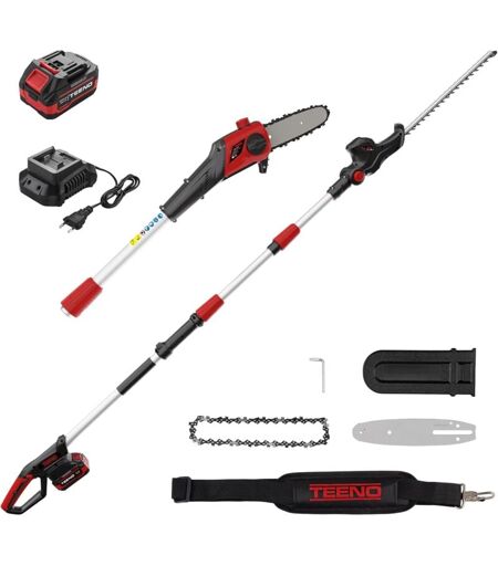 TEENO 2-en-1 Élagueur sur Perche et Taille Haie Télescopique sans Fil Batterie Li-ION 20 V 4.0Ah, Poignée Principale Orientable Bandoulière Incluse,