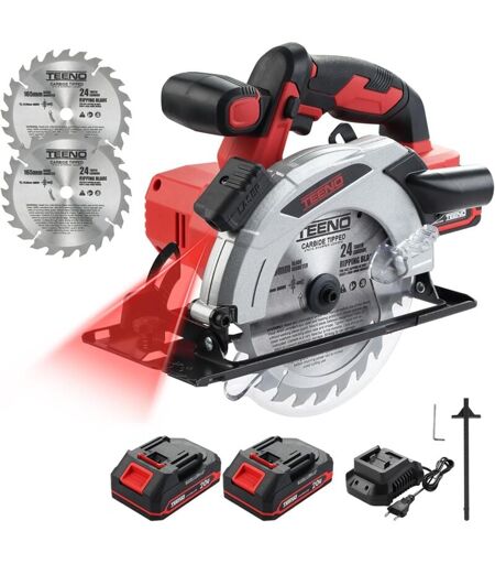 Teeno - Scie circulaire laser sans fil,frein électrique,20v 2 x 2.0 ah batteries, 2X165mm lames, 4000 RPM,profondeur et angle de coupe réglables