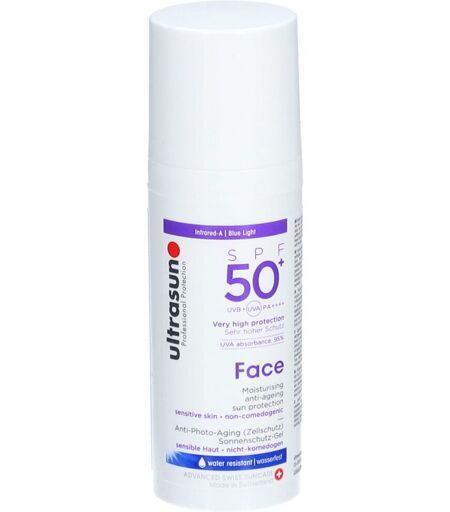 Ultrasun Gel solaire anti-âge FPS 50 + Combinaison spéciale de protection lamellaire à large spectre SPF50+, GSP pour la protection contre les infrarouges, dioxyde de titane pour la protection contre la lumière bleue et ectoïne. Pour une hydratation optimale, réduit l'apparence du vieillissement dû au soleil (rides, ridules, pores dilatés). Texture très rapidement absorbée, extrêmement légère et non grasse. Idéal pour les peaux sensibles (protection solaire et hydratation du visage, du cou et du décolleté).Bénéfices non comédogène résistant à l'eau sans parfum idéal en cas d'allergie au soleil, non gras sensation de douceur sur la peau Fabriqué en Suisse Antioxydants, Ectoïne®Application Appliquer généreusement avant l'exposition au soleil. Réappliquer régulièrement, et particulièrement après s'être baigné, essuyé ou avoir transpiré afin de maintenir la protection. Éviter la surexposition au soleil. Les écrans solaires, même les plus élevés, ne protègent pas totalement des rayons UV. La surexposition au soleil représente un risque majeur pour la santé. Protéger les bébés et les jeunes enfants de la lumière directe du soleil. Éviter le soleil intense de la mi-journée. Attendre l'absorption complète du produit et éviter le contact direct avec les tissus afin de prévenir leur décoloration.IngrédientsAqua, Caprylic/capric triglyceride, Pentylene glycol, Methylene bis-benzotriazolyl tetramethylbutylphenol (nano), Titanium dioxide (nano), Ethylhexyl salicylate, Bis-ethylhexyloxyphenol methoxyphenyl triazine, C12-15 alkyl benzoate, Diethylamino hydroxybenzoyl hexyl benzoate, Ethylhexyl triazone, Glycerin, Silica, Squalane, Cocoglycerides, Hydrogenated phosphatidylcholine, C8-22 alkyl acrylates/methacrylic acid crosspolymer, Acrylates copolymer, Ectoin, Decyl glucoside, Vitis vinifera seed extract, Propyl alcohol, Cetyl phosphate, Cétyl alcohol, Alcohol, Sodium hydroxide, Xanthan gum, Propylene glycol, Lecithin, Tocopheryl acetate, Ascorbyl tetraisopalmitate, Tocopherol, Diisopropyl adipate, Ubiquinone, Citric acid ...