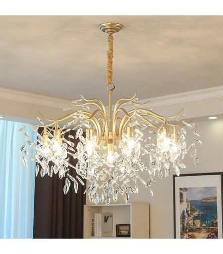 SENDERPICK Lustre de luxe à 8 branches en cristal + une tête d'éclairage Plafonnier en cristal clair Lustre en cristal de verre Métal classique Convient à la