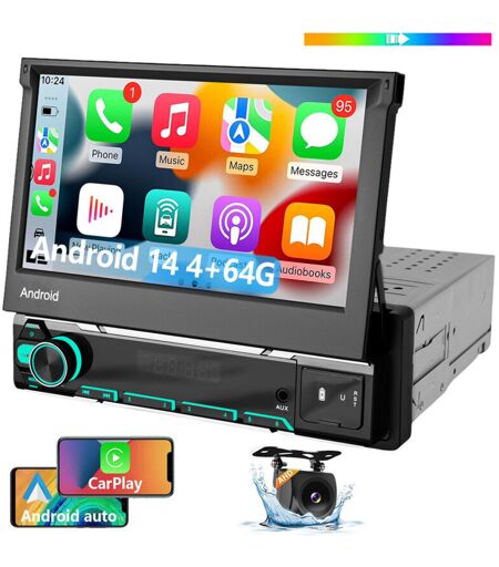 Essgoo - Autoradio 1DIN avec caméra Android 14, Apple Carplay, gps, navigation, rds, wifi, Bluetooth - 4+64G cam