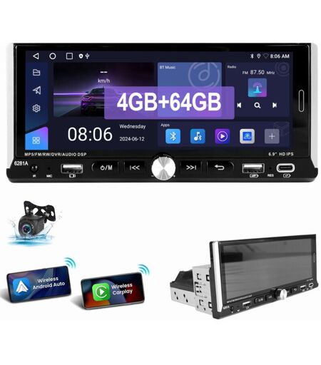 ESSGOO Autoradio 6,9" IPS 1 DIN avec Android 14 Carplay Android Auto GPS RDS Bluetooth FM WIFI 2+64G CAM