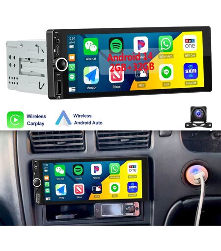 Principaux avantages : Autoradio Android 14 avec écran tactile – Cet autoradio, doté d'une résolution de 1280 x 480, de 2/4 Go de RAM et de 32/64 Go de ROM, dispose d'un écran tactile numérique HD IPS de 6,86 pouces prenant en charge la lecture vidéo HD 1080p pour une excellente visibilité. Plusieurs interfaces utilisateur bien conçues sont disponibles, ce qui en fait le choix idéal pour un autoradio. CarPlay sans fil et Android Auto : Plongez dans une expérience d'infodivertissement fluide et intuitive avec Apple CarPlay et Android Auto. Connectez votre iPhone à Apple CarPlay ou votre smartphone Android à Android Auto et accédez en toute sécurité à vos appels, SMS, navigation, musique et bien plus encore. Grâce à une utilisation intuitive via l'écran tactile ou la commande vocale, toutes les fonctions sont à portée de main, tout en restant au volant en toute sécurité. Utilisez vos applications préférées et restez connecté à tout moment, sans quitter la route des yeux. Transformez ...