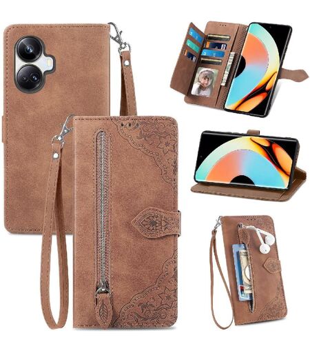 Étui Pour Oppo Realme 10 Proplus Affaires Portefeuille Fente Multi-Carte Multi-Couleur Fermeture Éclair Style - Le Brun