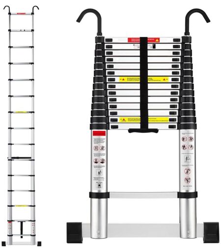 TEENO Échelle Télescopique en Aluminium, 4,4 m,Escabeau Telescopique Pliable avec Barre Stabilisatrice et Crochets Amovibles, Marchepieds