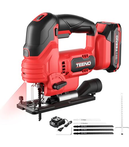 TEENO 20V Scie Sauteuse Sans Fil avec 1x2.0Ah Batteries, 800-3000 SPM Scie Sauteuse Laser avec 3 lames bois, 1 lames à métaux et 1lame PVC,