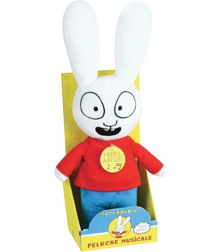 PELUCHE MUSICALE ENFANT AVEC CHANSON TV: Cette peluche Simon de 30 cm chante le générique « caca boudin » lorsqu¿on appuie sur son ventre une peluche caca boudin conçue pour amuser les petits et faire découvrir la série Simon super lapin INSPIRÉE DE LA SÉRIE SIMON SUPER LAPIN : Peluche Simon représentant le personnage de la série télé pour enfants, qui invite à explorer la joie de vivre et les émotions du quotidien ! Jouet en peluche pour bébé dès la naissance conçu pour encourager la curiosité et le jeu ! STIMULE L'ÉCOUTE : La peluche musicale pour enfant diffuse une chanson drôle suite à une pression sur son ventre et encourage l¿expression des émotions en lien avec les aventures de Simon super lapin. Un jouet bébé pensé pour éveiller les enfants ! UTILISATION SÉCURISÉE DES LA NAISSANCE : Cette peluche Simon est lavable en surface et conçue avec des piles fournies non accessibles. Peluche douce SIMON caca boudin pour enfants dès la naissance ! JOUET INTERACTIF & MARQUE FRANCAISE : Peluche Simon Super Lapin avec répliques cultes et look coloré, conçue par Jemini, marque française en Sarthe. Amuse dès la naissance avec 50 ans de savoir-faire et de créativité..La livraison depuis la France est prévue dans 5 jours ouvrés, n'hésitez pas à passer votre commande ...