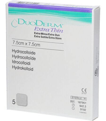 Taille du pansement: 7,5 cm x 7,5 cm Indication: Pansement Extra-Mince est destiné au traitement des plaies chroniques ou aiguës peu exsudatives Description du produit: Les pansements DuoDERM® Extra-Mince sont des pansements hydrocolloïdes stériles constitués de deux couches et présentés individuellement sous blister : Couche externe: constituéed’un film de polyuréthane. Cette couche externe est imperméable aux bactéries et aux liquides et assure également la protection mécanique de la plaie. Couche interne: constituée d’hydrocolloïdes (pectine, gélatine, carboxyméthylcellulose de sodium) répartis dans une matrice alvéolaire adhésive constituée d’un mélange de polymère inerte (polyisobutylène) + polymères adhésifs élastomériques. Cette face destinée à être au contact de la plaie et de la peau péri-lésionnelle est protégée par un papier silicon Conseils d'utilisation: Nettoyer et désinfecter la blessure avant d'appliquer le pansement. Conditionnement Boîte de 5 pansements ...