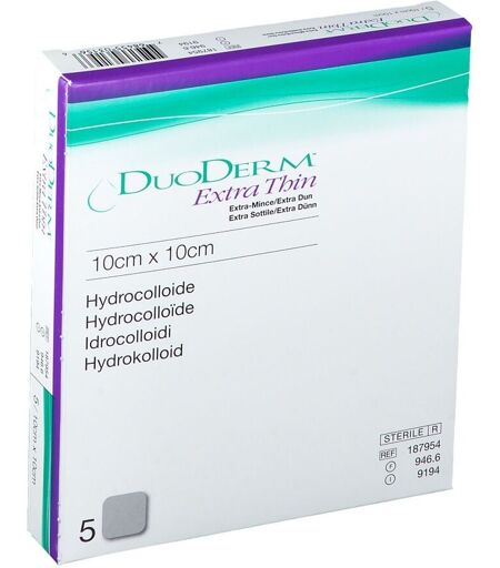 Taille du pansement:10 cm x 10 cmIndication:Pansement Extra-Mince pour le traitement des plaies légèrement exsudativesDescription du produit:Pansement DuoDERM® Extra mince est un pansement hydrocolloïde indiqué pour le traitement des plaies légèrement exsudatives. Il combine une formulation hydrocolloïde unique de ConvaTec qui la distingue des autres pansements hydrocolloïdes et un film extérieur perméable à la vapeur pour créer un environnement humide occlusif.Conseils d'utilisation:Nettoyer et désinfecter la blessure avant d'appliquer le pansement.ConditionnementBoîte de 5 pansements ...