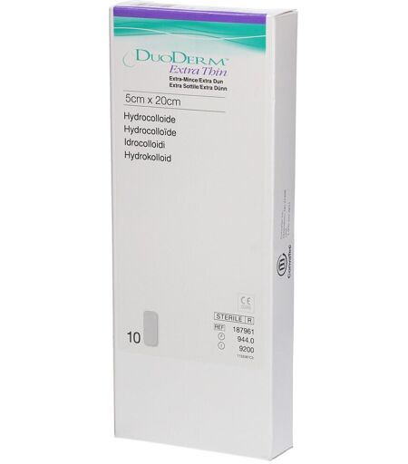 Taille du pansement: 5 cm x 20 cm Indication: Pansement Extra-Mince est destiné au traitement des plaies chroniques ou aiguës peu exsudatives Description du produit: Les pansements DuoDERM® Extra-Mince sont des pansements hydrocolloïdes stériles constitués de deux couches et présentés individuellement sous blister : Couche externe: constituéed’un film de polyuréthane. Cette couche externe est imperméable aux bactéries et aux liquides et assure également la protection mécanique de la plaie. Couche interne: constituée d’hydrocolloïdes (pectine, gélatine, carboxyméthylcellulose de sodium) répartis dans une matrice alvéolaire adhésive constituée d’un mélange de polymère inerte (polyisobutylène) + polymères adhésifs élastomériques. Cette face destinée à être au contact de la plaie et de la peau péri-lésionnelle est protégée par un papier silicon Conseils d'utilisation: Nettoyer et désinfecter la blessure avant d'appliquer le pansement. Conditionnement Boîte de 10 pansements ...