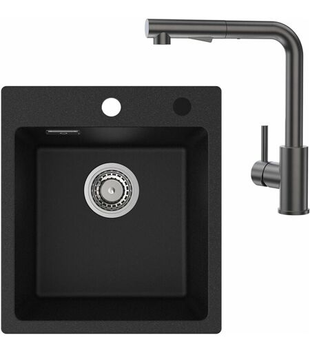 Cecipa - Evier Cuisine Noir 1 Bac Granit 40x45cm+Robinet Cuisine Douchette Gris Noir, Évier de Granit Rectangulaire, Petit Evier Granit, Cuve Simple