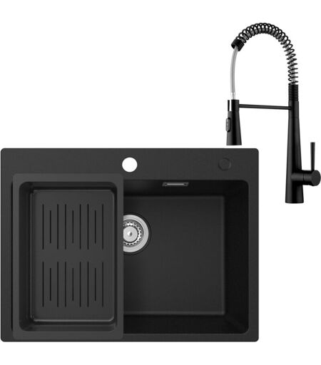 Cecipa - Evier Cuisine 1 Bac 60 x 45 cm avec Mitigeur à Ressort, Evier Noir en Granit avec Panie de Vidange, Lavabo Cuisine pour Meubles Bas de 60