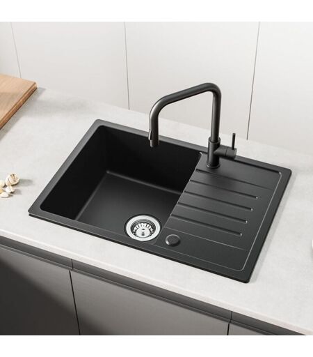 CECIPA Evier Cuisine 1 Bac avec Egouttoir 65 x 45 cm, Evier Noir en Granit, Lavabo Cuisine 1 bac, Évier Cuisine Installation Réversible, avec Siphon
