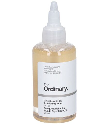 The Ordinary Glycolic Acid 7% Tonique ExfolianteTonique Exfoliant à l’Acide Glycolique 7% est une lotion exfoliante à base d’eau formulée avec 7 % d’acide glycolique, un acide alpha-hydroxylé (AHA) reconnu pour son efficacité à exfolier la peau. Il aide à éliminer les cellules mortes, révélant une texture plus lisse et uniforme. Une utilisation régulière de ce tonique exfoliant favorise une peau plus lumineuse et éclatante tout en réduisant visiblement les rides, ridules et autres signes de l'âge.Cette formule contient également un dérivé de poivre de Tasmanie, un extrait végétal apaisant qui aide à réduire les irritations fréquemment associée à l’exfoliation, permettant ainsi une utilisation régulière. La présence de cet ingrédient naturel peut entraîner des variations de couleur saisonnières dans la formule. Avec un pH soigneusement calibré d’environ 3,6, ce tonique présente un équilibre optimal entre le sel et l’acidité.Cette formule multifonctionnelle n’est pas seulement efficace sur le visage, mais peut également être appliquée sur le cuir chevelu afin d'aider à rééquilibrer, hydrater et réduire la sécheresse. Ce produit ne doit pas être utilisée sur les peaux sensibles, fragilisées ou qui pèlent. Pour des résultats optimaux, il est recommandé d'utiliser une protection solaire en raison de l'augmentation de la sensibilité de la peau face au soleil après l’utilisation.Les tests montrent :Une peau illuminée, un teint unifié et une texture de peau visiblement lissée.- Lisse considérablement le grain de peau. - Unifie le teint et illumine la peau. - Réduit l’apparence des rides et des ridules. Conseil The Ordinary : appliquez cette formule pour exfolier les petites zones du corps où la peau est rugueuse et bosselée. Image before-after: tests cliniques réalisés sur 30 sujets utilisant le produit 1 fois par jour pendant 6 semaines.Application Application sur le visage et le cou : appliquer une fois par jour, idéalement le soir. Appliquer sur le visage et le cou à l'aide d'un coton ou des doigts. Application sur le cuir chevelu : appliquer sur cuir chevelu sec, trois fois par semaine. Incliner la tête vers l'arrière et utiliser l'embout pour appliquer doucement le produit de l'avant vers l'arrière de la tête en effectuant des mouvements de balayage. Bien masser. Avertissement : Ne pas rincer. Ne pas utiliser sur une peau sensible, fragilisée ou qui pèle. Éviter le contour des yeux et le contact avec les yeux. Le contact entre le produit et la peau doit être limité en fréquence ou en durée. Avertissement coup de soleil : ce produit contient un acide alpha-hydroxy [AHA] qui peut augmenter la sensibilité de votre peau au soleil, et notamment le risque de coup de soleil. Utiliser un écran solaire, porter des vêtements protecteurs et limiter l'exposition au soleil pendant l'utilisation de ce produit et la semaine qui suit. Utiliser uniquement selon les instructions. Le produit ne doit pas être appliqué sur la peau trop fréquemment ou sur une longue... ...