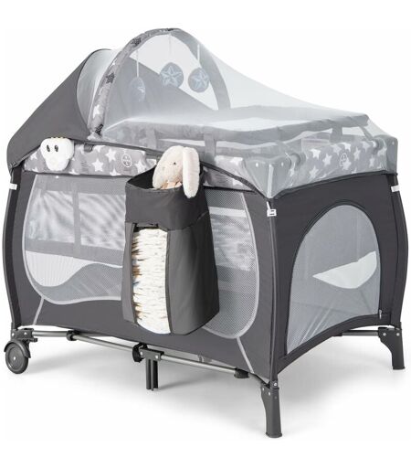 Costway - 5 en 1 Lit Parapluie Bébé avec Matelas & Moustiquaire, Lit Bébé Evolutif avec Table à Langer, 3 Jouets Mignons & Boîte à Musique, Sac de
