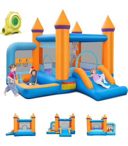 GOPLUS Château Gonflable pour Enfants, Aire de Jeux Gonflable avec Souffleur 680W,Toboggan, Piscine, Espace de Saut, Panier de Basket (Orange, avec