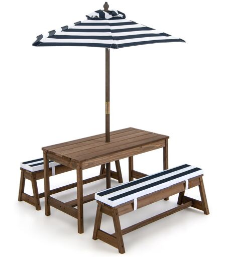 CostwayTable et 2 Bancs de Jardin avec Parasol et Coussins en Sapin Table de Pique-nique pour 4 Enfants Bleu