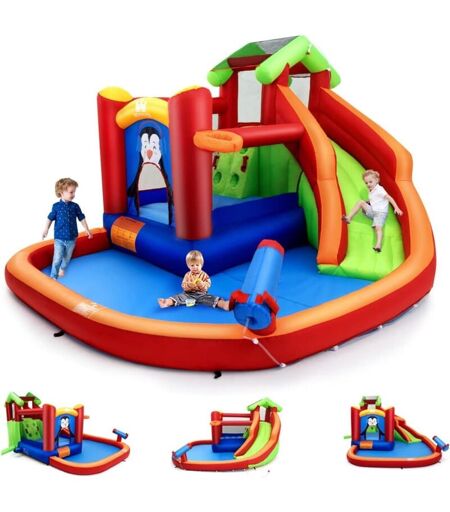 6 en 1 Château Gonflable pour 3 Enfants 3-10 Ans, Structure Gonflable avec Toboggan,Pataugeoire,etc. Rouge&Sans Souffleur - Goplus
